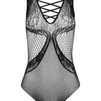 De sexy mesh bodysuit FB004 betovert met zijn verleidelijke design en verfijnde details. De diepe halslijn, elegant verbonden met elastische bandjes, accentueert prachtig de vrouwelijke vormen, terwijl de laag uitgesneden rug een extra sensuele touch toevoegt. Dit bodysuit combineert op meesterlijke wijze delicate kanten patronen met grove en fijne mesh, wat een opvallend contrast creëert. Het open kruis versterkt de sensuele uitstraling, terwijl het rekbare materiaal zorgt voor een comfortabele pasvorm en een flatterende vorm. Perfect voor speciale momenten en zelfverzekerde verschijningen.